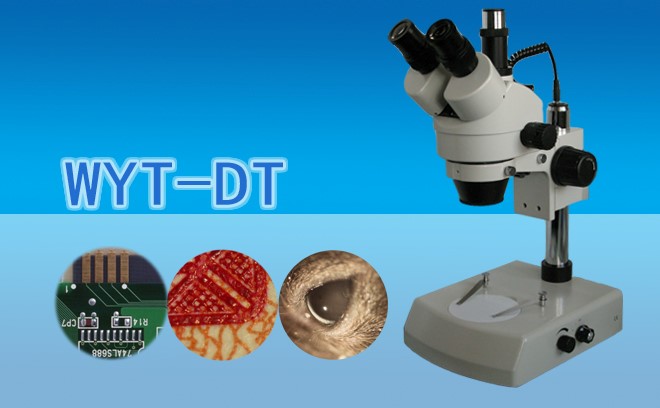 三目连续变倍体视显微镜WYT-DT配置了高眼点大视野目镜,物镜可连续变倍。具有视场宽广,分辨率高,立体感强,成像清晰等特点。广泛用于教学示范、生物解剖、农林业的种子检查筛选、 公安部门的刑侦检测,电子精密部件装配检修,纺织业的品质控制、文物 邮票的辅助鉴别及各种物质表面观察。总放大倍数:7X-45X